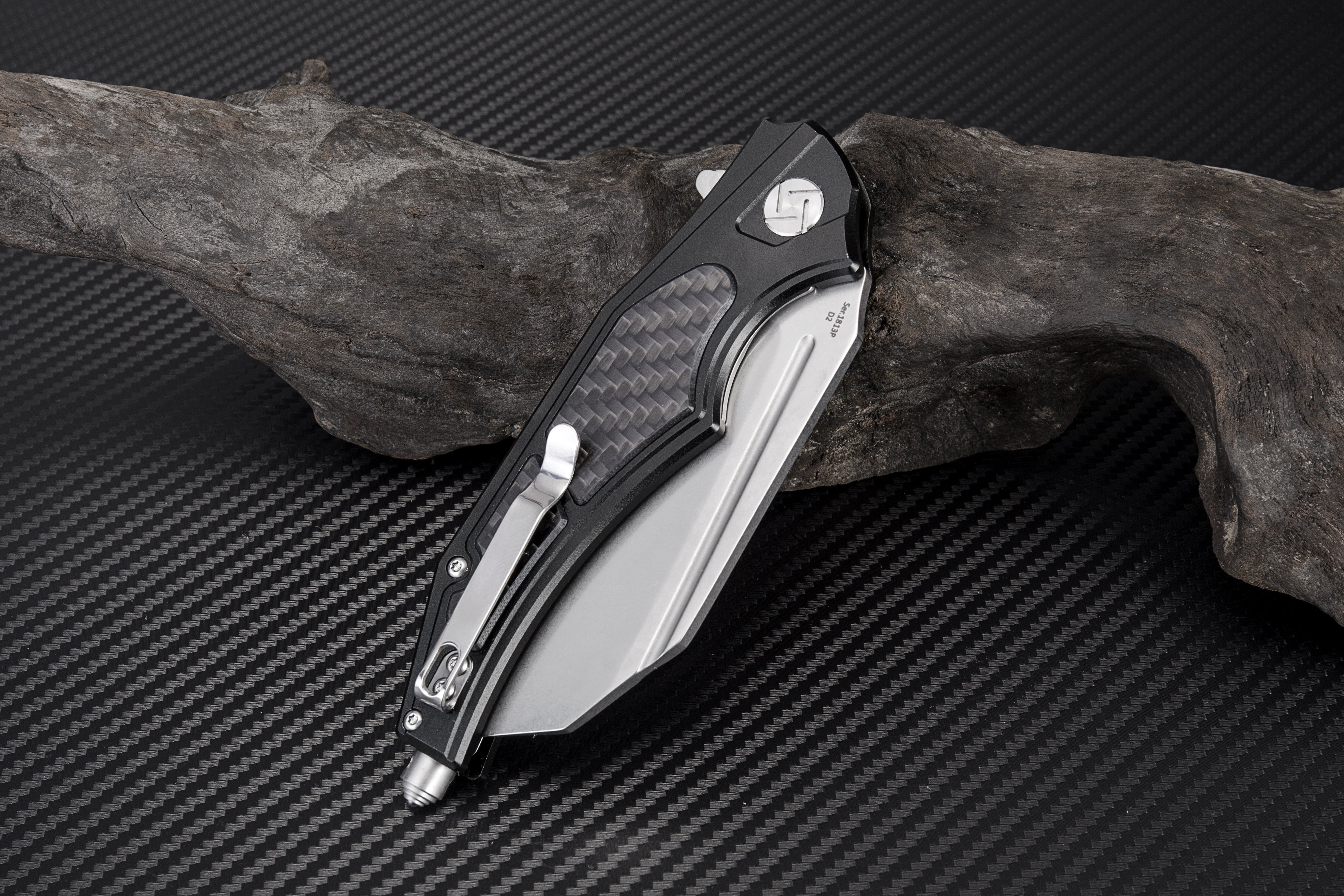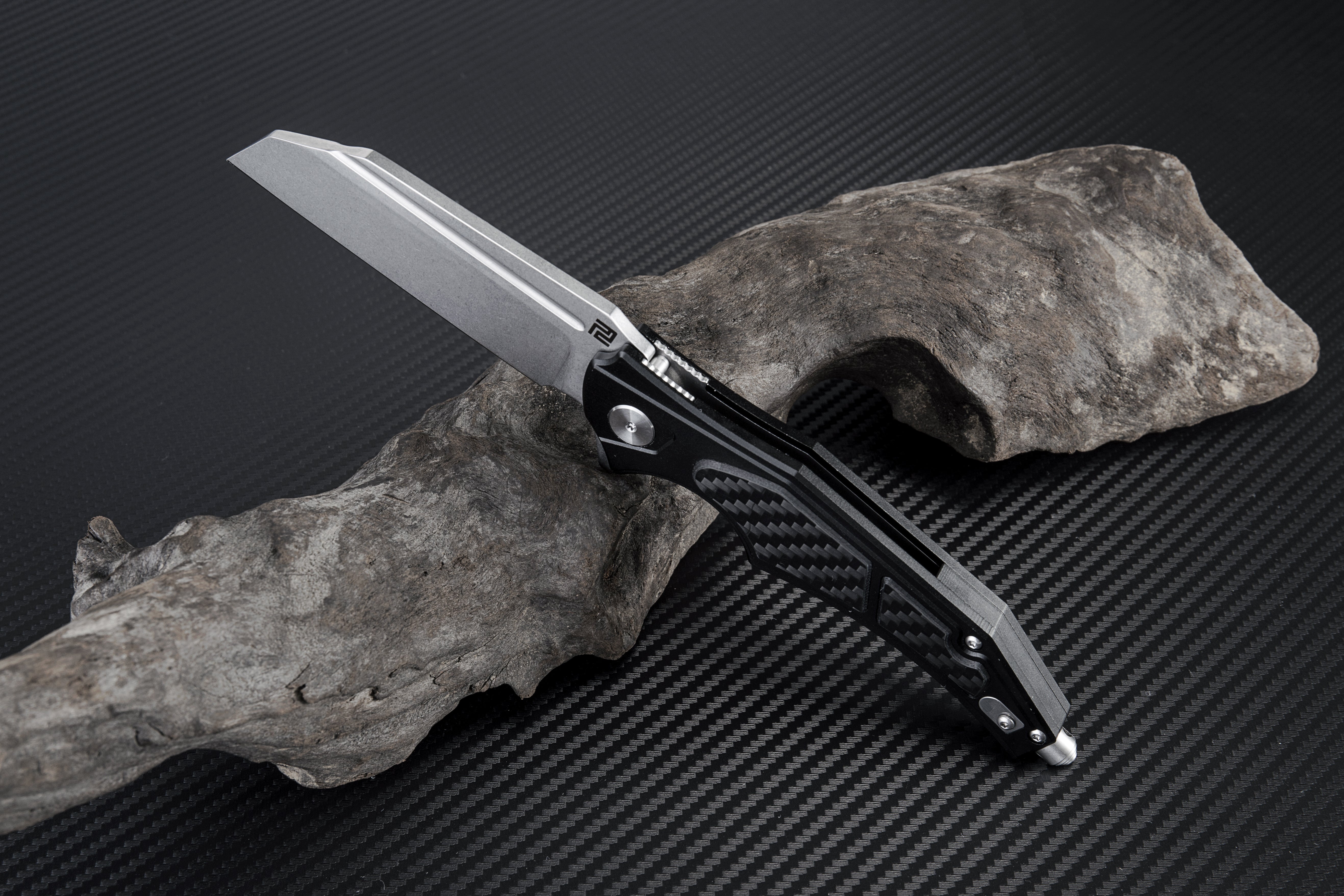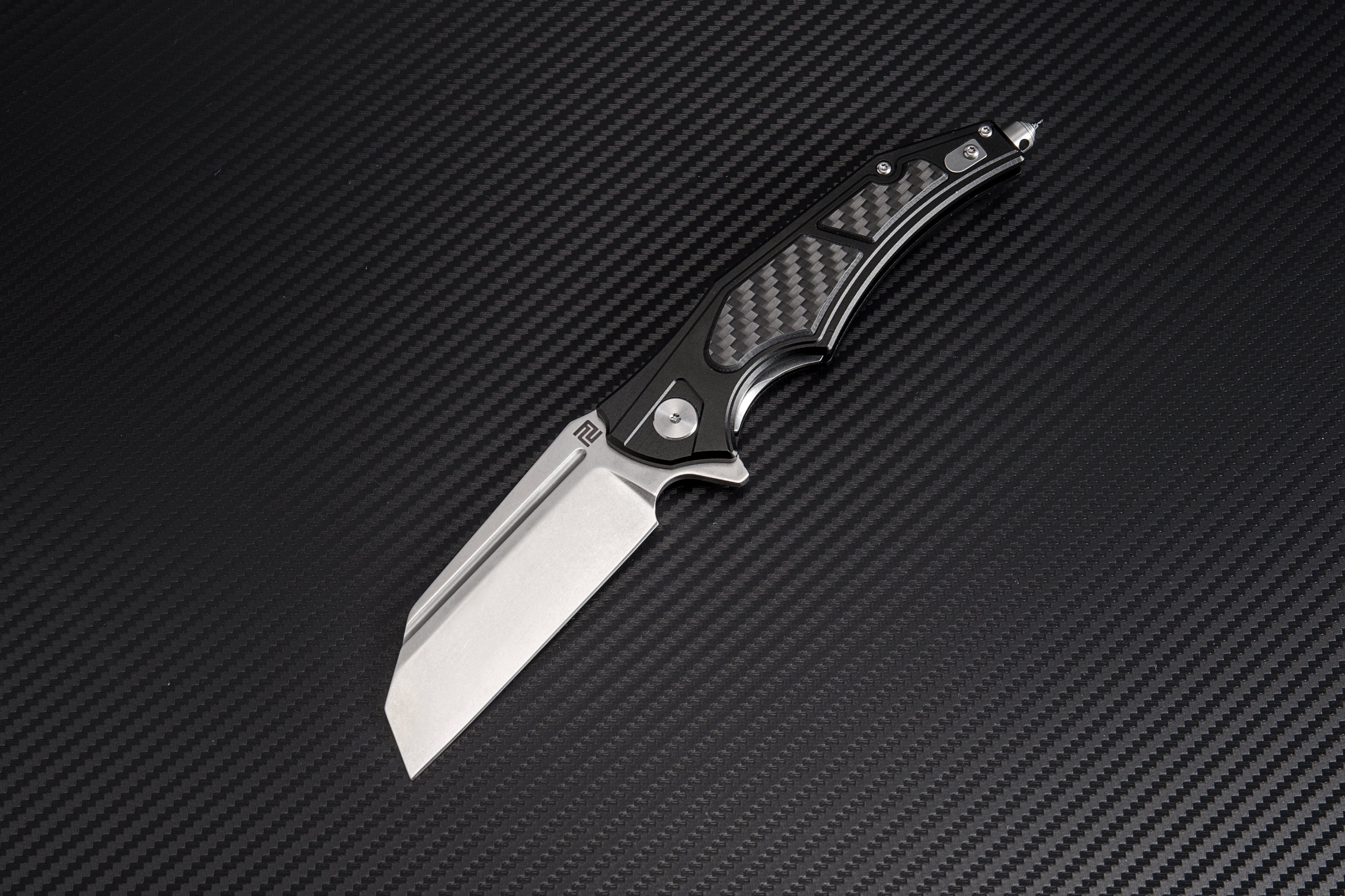 The ArtisanCutlery Apache Nomad is one serious folder with an immense amount of cutting power. It sports a wide 3.82" D2 tool steel blade that is very sharp out of the box and the flat ground Wharncliffe blade is a very versatile cutter. Due to the design of the thumb ramp, if you need to choke up close to the blade for precise work - you can. It's a great design made with a liner lock and deep carry pocket clip that is reversible. The carbon fiber onlays give the handles that touch of style that sets this knife apart. It also comes with a window breaker on the bottom of the handles, making it the perfect EDC knife. If you need a solid tactical folder, look no further than the Apache by ArtisanCutlery.