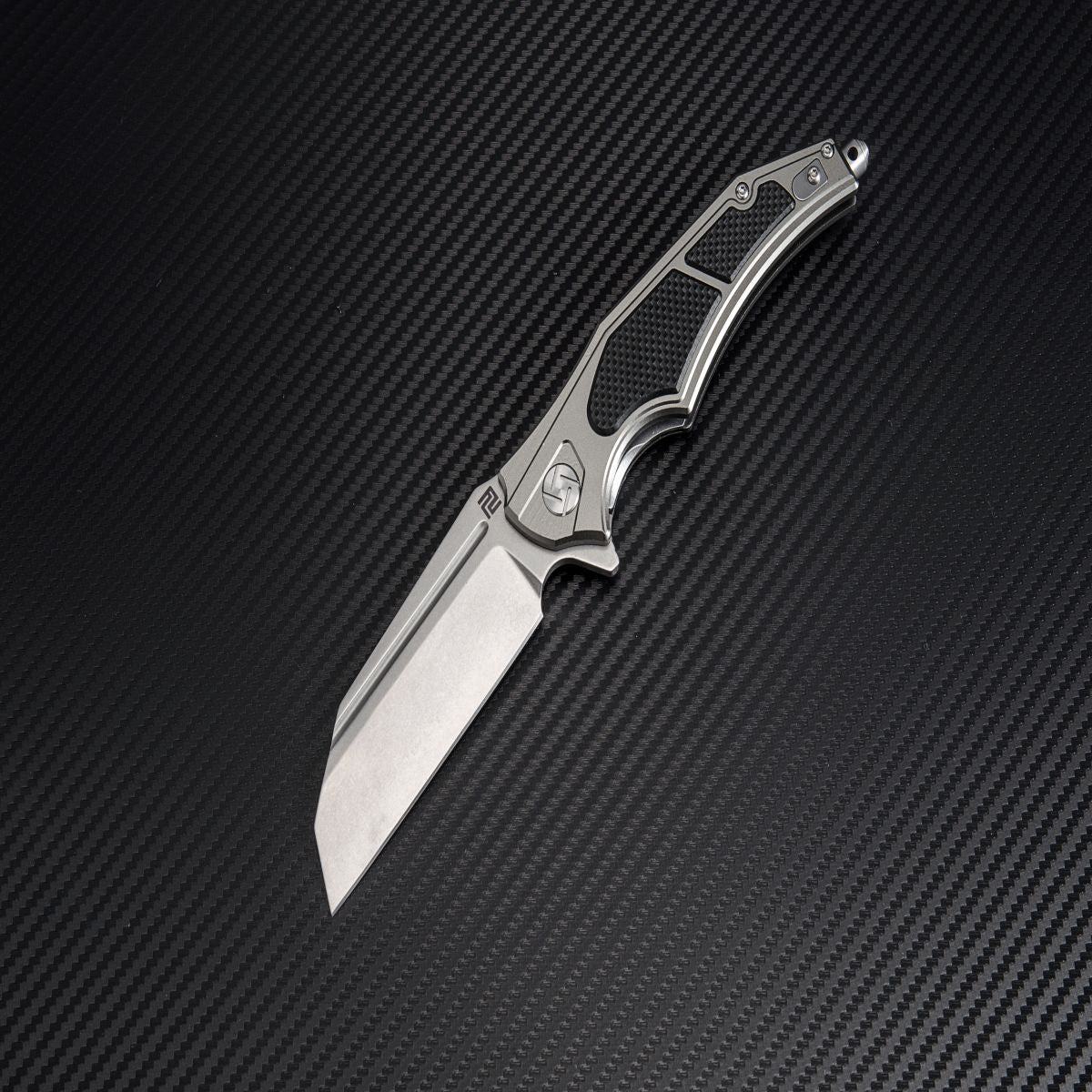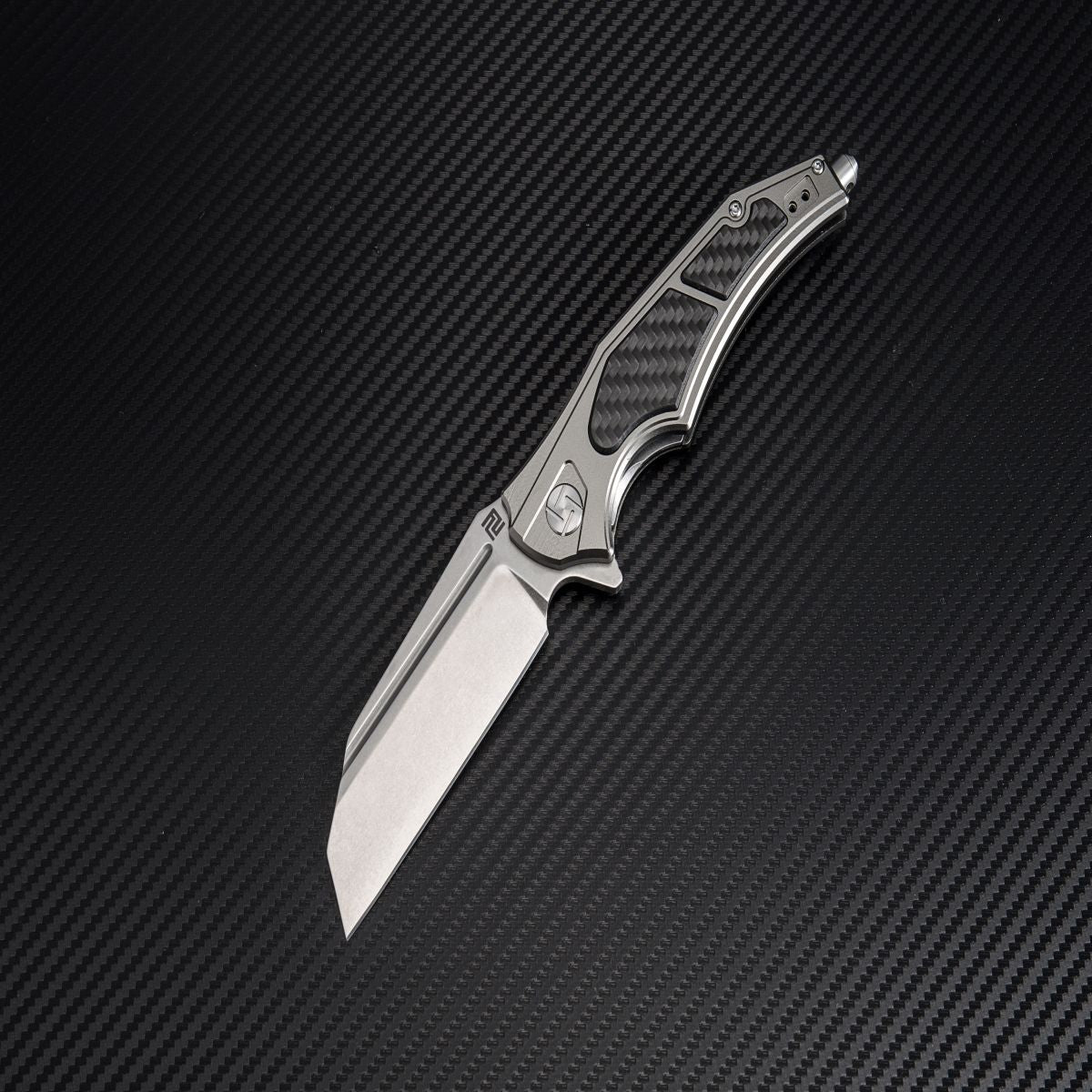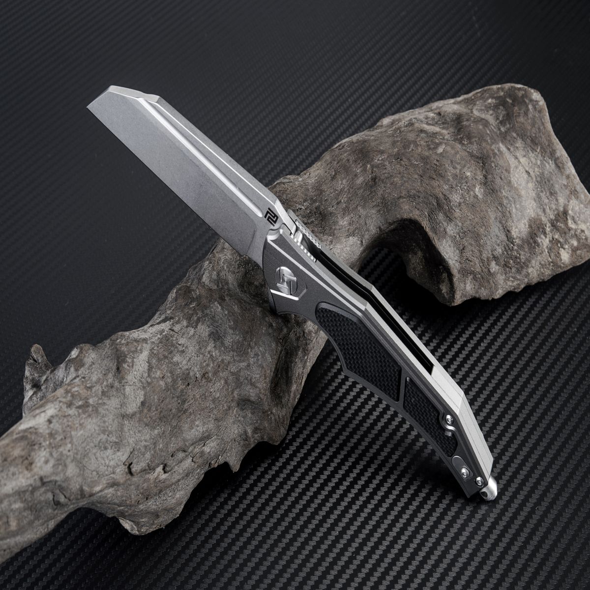 The ArtisanCutlery Apache Nomad is one serious folder with immense cutting power. It sports a wide 3.70" D2 tool steel blade that is very sharp out of the box and the flat ground Wharncliffe blade is a versatile cutter. Due to the design of the thumb ramp, if you need to choke up close to the blade for precise work - you can. It's a great design made with a reversible liner lock and deep carry pocket clip. The carbon fiber Onlays give the handles that touch of style that sets this knife apart. It also comes with a window breaker on the bottom of the handles, making it the perfect EDC knife. If you need a solid tactical folder, look no further than the Apache by ArtisanCutlery.