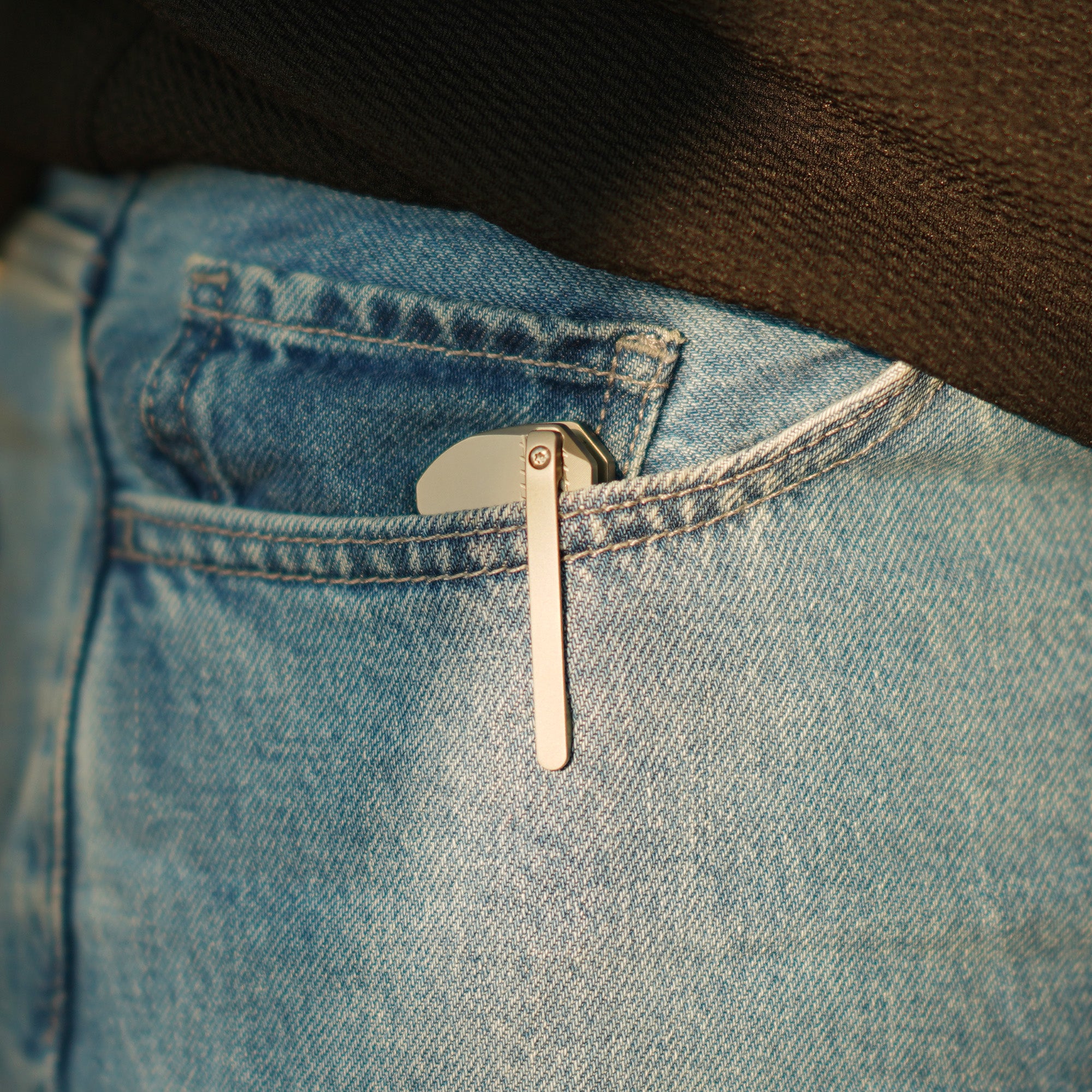 As knife enthusiasts, one often pondered question is that of the desert island knife. If you were stranded on a deserted island and could only have one knife, what would it be? For this design, I tried to distill features that I love from different designs into one knife I could be happily stranded with, and that's the Crusoe. It is a full size knife, big enough to do some serious work, but sleek enough to forget about in pocket. It features a neutral handle profile with an index finger cutout and widened back end to provide just enough security but not get in the way when using different grip options. The handle spine is gently concave for maximum comfort in hard bearing tasks, and leads uninterrupted into the robust drop point blade. The low tip makes utility cuts easier to manage, while maintaining enough belly for slicing performance. Using thicker blade stock combined with a high flat grind and swedge, the blade is strong enough to put up with some measured abuse but precise enough to slide through material and perform detailed work. The construction is simplified to just a single barrel spacer through which the clip is attached, relying on the thicker yet gently tapered titanium handles for stability. The bearing action is smooth and addicting, with both opening hole and front flipper deployment options, and easily accessible lock bar disengagement. It's a do it all knife, a trusty companion, a worthy desert island pick.
