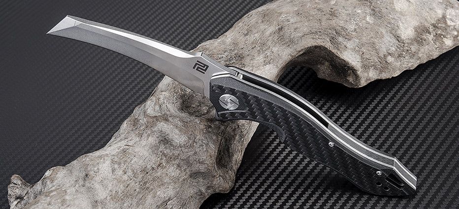 Model - ATZ1816GBUS. Artisan 1816GBUS - Eagle Framelock S35VN Stainless Blade Knife with Blue Titanium Handle. Eagle Framelock. 5" closed. 3.63" satin finish S35VN stainless curved blade. Blue titanium handle with carbon fiber inlay. Extended tang. Lanyard hole. Pocket clip. Metal tin. Black nylon zippered storage case. Boxed.
