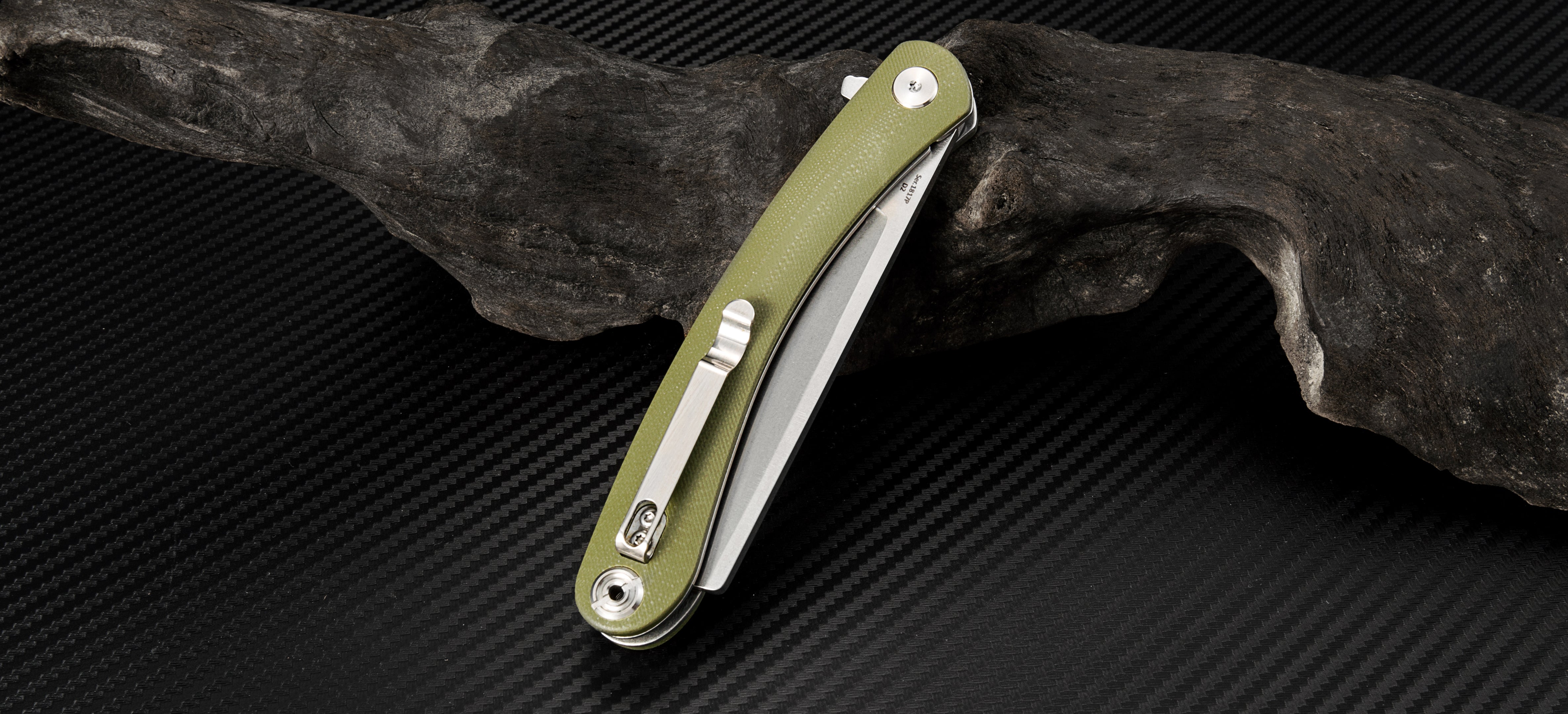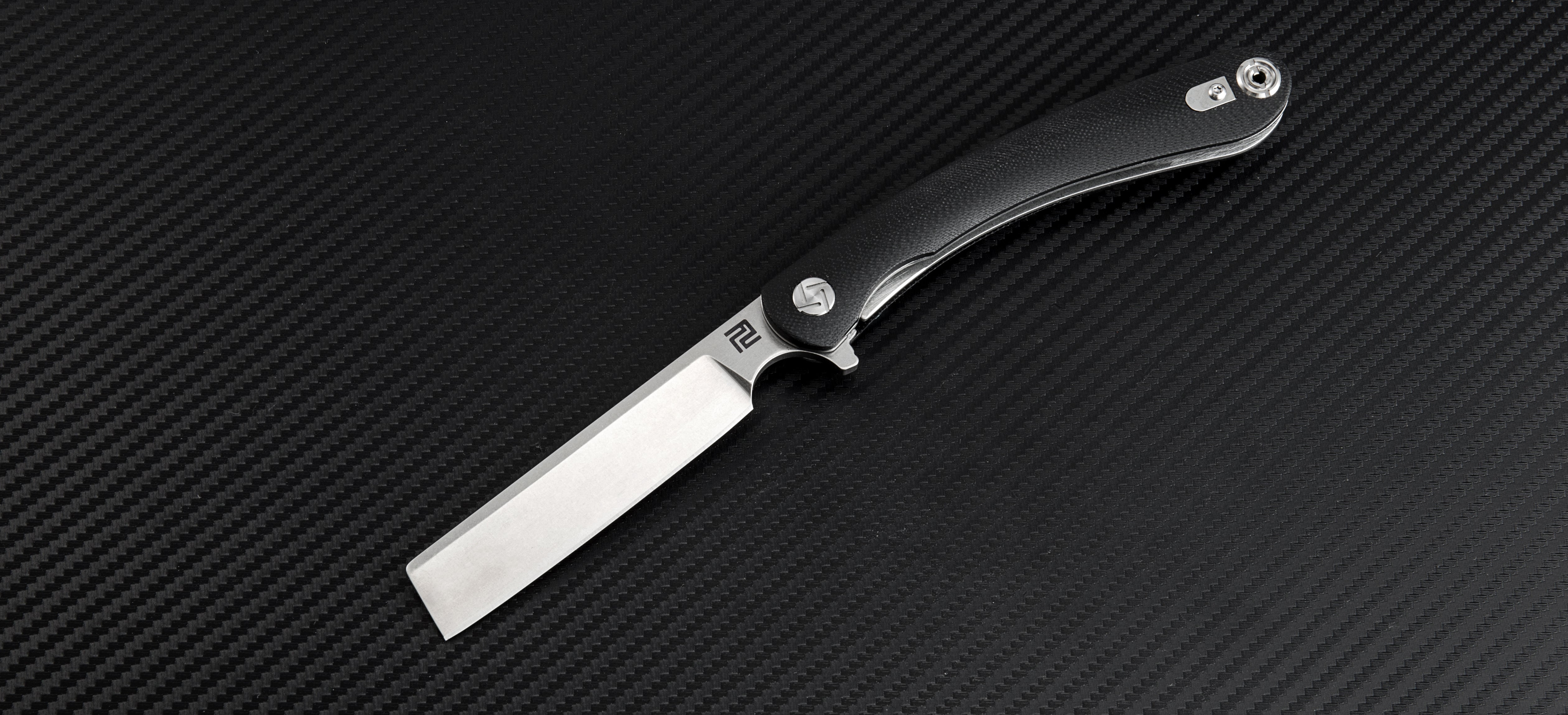 The Orthodox from ArtisanCutlery is a flipper with a slim profile and straightforward design. The blade is finished in stonewash and shaped in the style of a razor. The handles are made from G10 and are shaped to fit the hand and the flipping action is smooth as butter. The handles feature a lanyard hole and reversible pocket clip for added convenience.