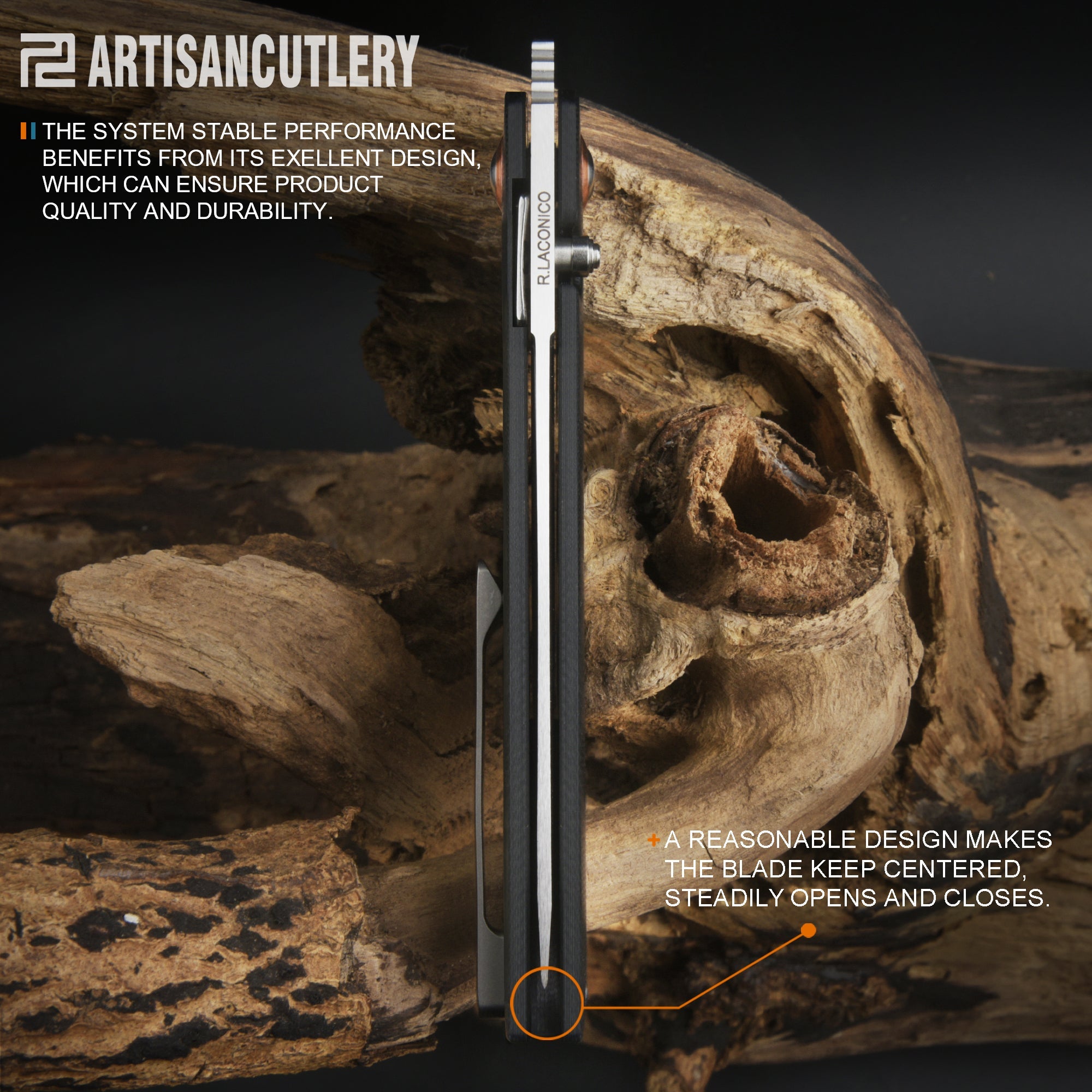 The 1849 Sirius is a sleek gentleman's flipper knife designed by Ray Laconico. Its clean lines and unobtrusive profile provide comfort while carrying it in your hand or pocket. The drop point blade is deployed either the front flipper tab or the recessed thumb stud, and the blade flies open thanks to Artisan's standard ceramic ball bearing pivot design that works so well. When closed, the blade almost disappears into the handle and the thumb stud moves discreetly into a milled groove to reduce the profile as much as possible. The handles are comfortable in the hand and come in a variety of materials to suit what you are looking for. With a simple, clean pocket clip, the Sirius is easy to carry and impresses in any situation you would bring it in to.