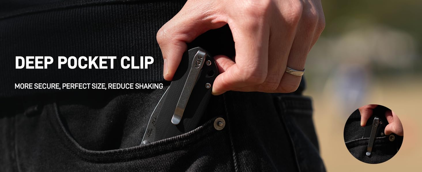 - A Deep Carry Pocket Clip, keeping the knife tucked quietly away and handy for both left and right handed users.