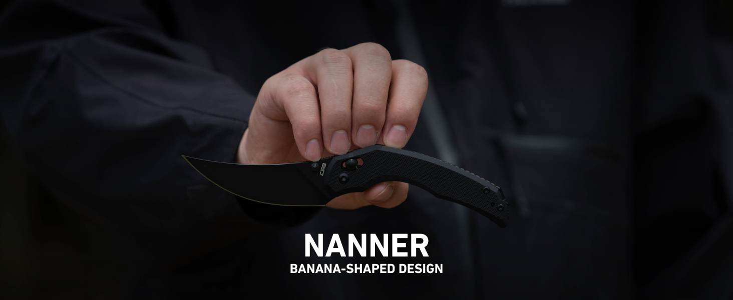 The nanner is my attempt to create an upswept blade that would still have a usuable tip for utilitarian tasks. With the blade initially coming from the handle at a downward angle and sweeping back up the tip remains positioned in line with your hand when you hold it. The shape of the handle sort of fell into place as a clear closed profile resembling a banana.